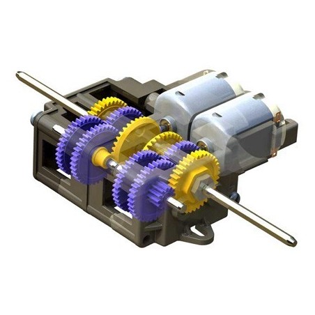 La caja de cambios doble de Tamiya es una unidad compacta con dos motores independientes y trenes de engranajes. Incluye dos motores y todos los engranajes y piezas para construir cualquiera de las cuatro posibles configuraciones de relación de transmisión (12,7:1, 38:1, 115:1 y 344:1).