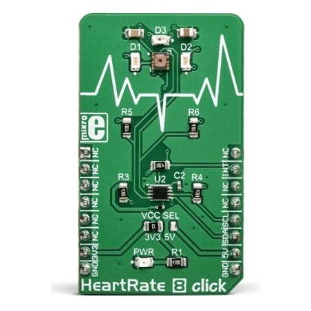 Esta tarjeta tiene un biosensor óptico, diseñado para la monitorización de la frecuencia cardíaca (HRM). Emplea un sensor especializado que incorpora tres controladores LED y dos elementos fotosensores, sensibles a la luz verde e infrarroja.