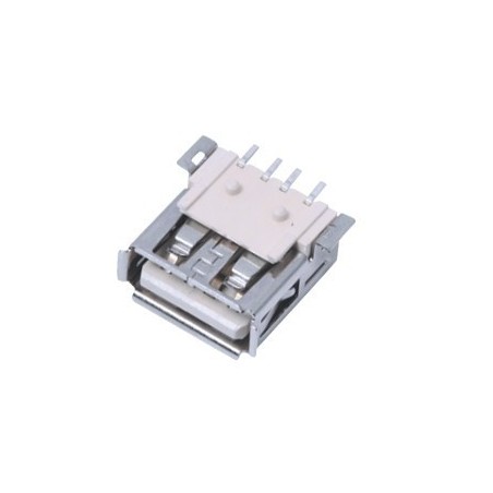 Conector USB Hembra de tipo A, tienen 4 pines, es de montaje SMD. Ideal para implementarlo en tus próximas placas PCB para tener una conexión rápida y segura ya sea para alimentación, programación o establecer comunicación con tus proyectos.