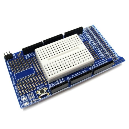 Esta placa de expansión ProtoShield está diseñada para construir un prototipo de circuito sobre un Arduino Mega.