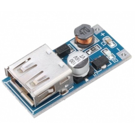 Este módulo es del tipo DC-DC y es muy útil cuando se requiere conectar un dispositivo que requiere 5V de alimentación tal como un celular, un dispositivo MP3, etc. Este módulo es capaz de convertir un voltaje tan bajo desde 0.9 V a 5 V en su salida.