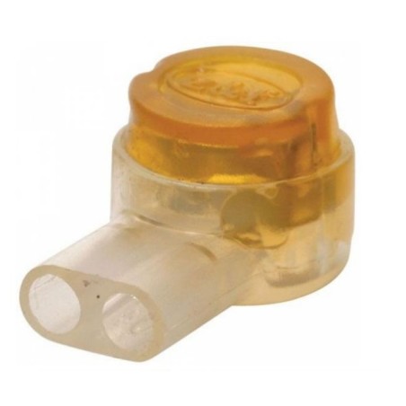 Conector "UY" de empalme telefónico para 2 vías, en color ámbar. Se utiliza para unir cable calibre 26 al 22 AWG o para recuperar la continuidad en un cable roto.